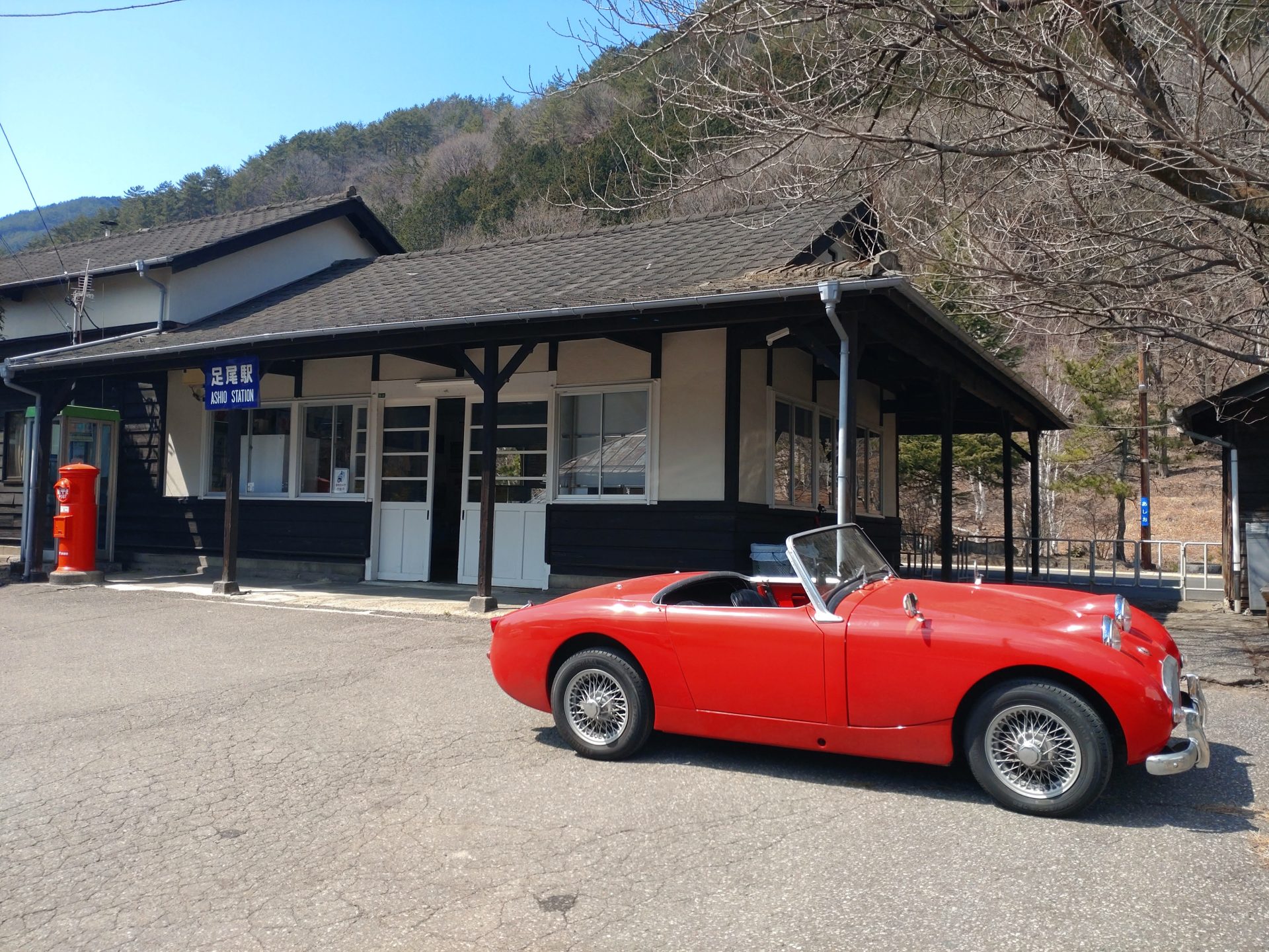 集まりが終わり、3台で足尾の町を散策。ちょっと古い駅舎に車がマッチしています。